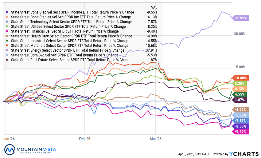 Sector performance in Q1 was dominated by a dramatic divergence between energy and the rest of the market. Energy (XLE) surged 37.9% during the quarter and continued to rally (+12.4%) after the conflict began, driven by a sharp spike in oil prices. Outside of energy, defensive and inflation-sensitive sectors such as telecom (IYZ +16.4%), materials (XLB +10.7%), and utilities (XLU +8.2%) performed relatively well in the 1st quarter. However, since the onset of the conflict, nearly all sectors have turned negative, including defensives like staples (XLP (-7.4%)) and utilities (-2.4%), suggesting broad-based risk reduction rather than selective rotation. Cyclical and growth-oriented sectors, such as technology, consumer discretionary, and financials, were among the weakest performers, reflecting concerns around slowing growth, tighter financial conditions, and elevated geopolitical risk.
