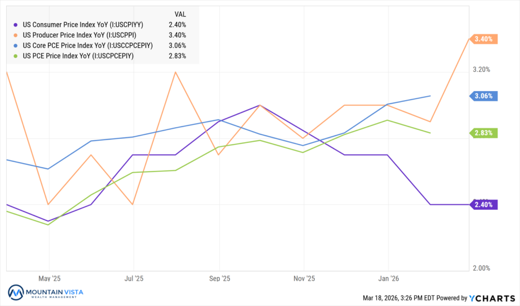 From late 2025 into early 2026, inflation dynamics shifted meaningfully from a moderating trend to a more persistent and, in some respects, re-accelerating environment. As shown in the chart, headline CPI moved higher into early 2026 (approximately 3.4%), while core PCE, the Federal Reserve’s preferred measure, firmed to just over 3.0% after appearing to stabilize in the high-2% range late last year. Perhaps more notably, producer price inflation (PPI) exhibited renewed volatility and upward pressure, reinforcing the idea that pipeline cost pressures were rebuilding.