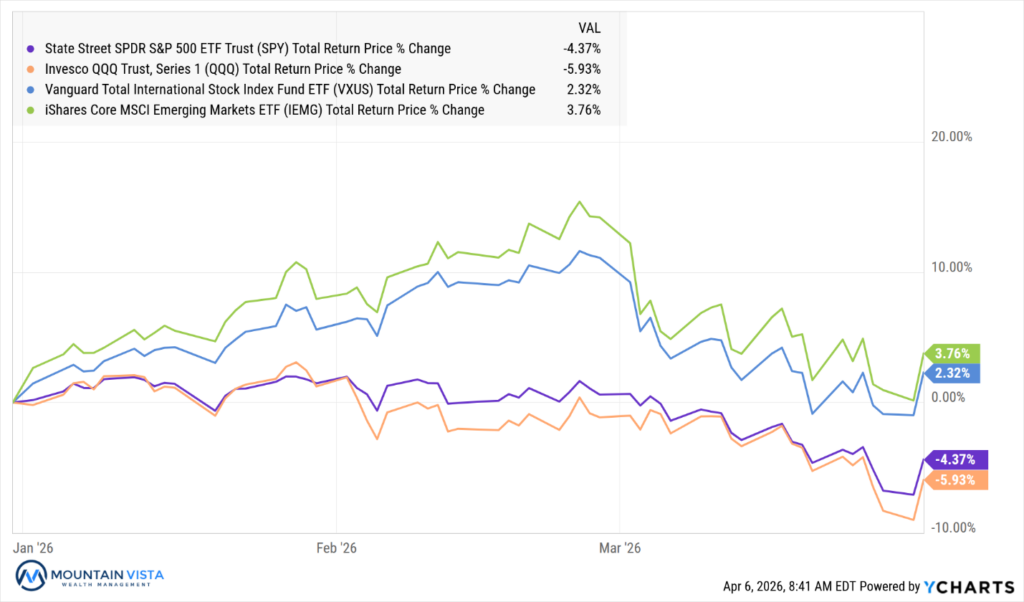 The first quarter of 2026 reflected a clear shift from early stability to a pronounced risk-off environment following the late-February escalation of the war with Iran. U.S. equities broadly declined, with the S&P 500 (SPY) falling (-4.4%) for the quarter and down (-5.9%) since February 25th. The Nasdaq 100 (QQQ) underperformed, dropping (-5.9%) in Q1 and (-6.3%) post-conflict, driven by weakness in growth-oriented names. Interestingly, small caps (IWM) held up better on a full-quarter basis, posting a modest 0.9% gain, though they fully participated in the selloff after the conflict began. Style dispersion was notable, with growth lagging value by 8.1%, though both cohorts declined meaningfully in the post-war period. International equities (VXUS +2.3%) and emerging markets (IEMG +3.8%) outperformed during the quarter, but this strength reversed sharply after February 25th, with both down 8–10%, highlighting a global de-risking trend and stronger dollar.